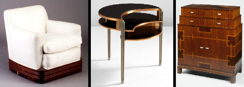 Eugene Schoen Furniture, from left - Armchair, White Silk Upholstery, Laminated Rosewood Veneer Base, Invaluable; Cocktail Table, Monel, Bronze, Bakelite and Steel, c. 1929, Phillips; Cabinet, Rosewood, Mahogany and Maple with Metal Pulls, mMade by Schmieg, Hungate and Kotzian, 1928, Art Institute of Chicago