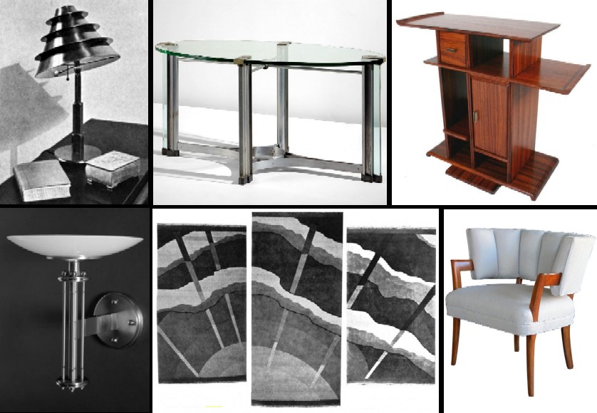Eugene Schoen Furniture and Lighting, from left - Table Lamp with Tilting Shade, Gunmetal Color, Metal, 1929, 'Table, Monel, Nickel, Duraluminum, Glass, RKO Roxy Theater, Ladies' Lounge, c. 1932, Phillip; Trends in Decoration', Good Furniture Magazine, Sept. 1929; Side Table, Rosewood, Hungate, Schmieg, and Kotzian, 1930s, 1st Dibs; Wall Sconce Light, Metal and Glass, 1924-32, Brooklyn Museum; Rugs, 'Modernistic Rugs Made in America', Good Furniture Magazine, July, 1928, p. 39.; Shellback Chairs, Wood and Upholstery, Restored, 1930s, 1st Dibs
