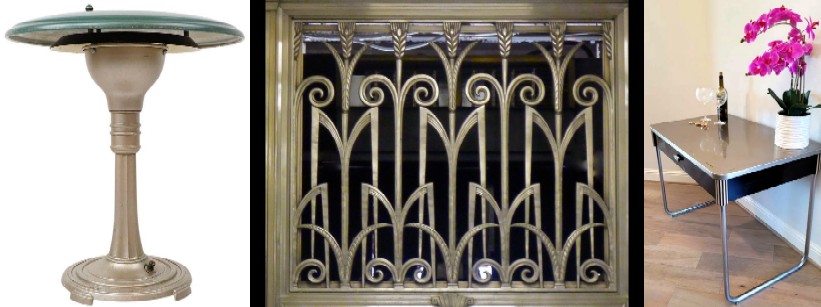 Monel Pieces, from left - Monel Saucer Lamp, Sight Light Corporation, c. 1940, 1st Dibs; Monel Metal, Transom Window - Above Door, The Chicago Board of Trade Building, flickr; Monel Top Smartline Table, Black Enamel Sheetmetal Body with Chromed Legs, International Nickel Company, Raymond Patten, 1930s, Etsy